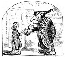A King was once hunting in a great wood, and he hunted the game so eagerly that none of his courtiers could follow him. When evening came on he stood still and looked round him, and he saw that he had quite lost himself. He sought a way out, but could find none. Then he saw an old woman with a shaking head coming towards him; but she was a witch.