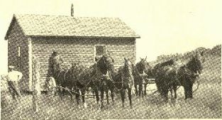 On Thursday we left for Swanson, nearly sticking in the sand more than once. At last the sub-radius rod broke with our continual skidding, but I was able to get another at a hardware store on the way. We reached Swanson that night and camped by the church. Next day we went to see the farmer's wife who had promised to get the people together to meet us. The family consisted of Mrs. Z., a widow, her daughter, and two sons. As we drove up we saw that the wheat was being cut. Some of the binders were drawn by motor tractors and others by horses. After the tea-supper, which is the last meal of the day, Winifred went to the piano to play songs for the girl. I noticed that the two brothers looked very tired after their day's work, and guessed that they were waiting up for us as I had seen that our room led through another. At last in desperation they went to bed, and we found them fast asleep when we went through. This shack was in advance of many, as it had a door between the rooms instead of a curtain, but the girl ingenuously suggested that as it was a hot night we should leave the door open.