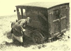 The next day (Sunday) we went on to Dinsmore, where the vicar lived whom we had met before at Bounty. We had not been able to hear from him, but knew he expected us to take a Sunday School and address parents somewhere in his district that afternoon. We started about noon, but lost our way, and when we inquired at a farm were wrongly directed, so we did not get to Dinsmore till 2.30. Just as we were entering the town we got on to a rough trail with a lot of big clods. A front wheel struck one of these and badly bent the steering-rod, which made it very difficult to steer the van, as it kept veering towards the left of the trail all the time. When we reached the vicarage we found the vicar had gone, but I knew that he had a service at Surbiton on Sunday afternoons and so asked the way there. The caravan got more and more difficult to steer. I tried to straighten the steering-rod with a tyre iron, but it was not strong enough. Then we came to a creek where there had been a bad wash-out, and a board up across the trail said "No road." But I noticed that cars had been going over the creek a little to the right, which meant going down a hill like the side of a house, over the stream, and up an equally steep hill on the other side. One needs to steer particularly well on these occasions, but I had to risk it and got across somehow.