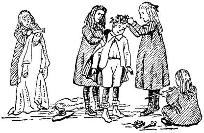 I had a solitary game of my own, played at bedtime; it was called 'Being Kind to Poor Pamela'. Pamela was a child with whom I sometimes played, but whom I rather despised. The game was played by getting out of bed and lying on the floor, until you were as cold as you could bear to be. During that time you were Poor Pamela, lying out in the snow in her nightgown, owing to the cruelty of her parents. She was starving and the wolves were howling in the woods all round. Then you became yourself again, and went out into the cold and rescued poor Pamela—the wolves were getting very near—and you put her into your own bed and warmed her, and fed her, and comforted her most tenderly. This made you feel frightfully good and kind; and you could do it over and over again, until you could keep awake no longer. On showing this passage to Margaret, she revealed that she had independently practised a variety of this sport, when put to bed with a hot-water bottle, because she had a cold; only it was not Pamela whom she impersonated by lying naked on the oil-cloth, but a mother with a baby (a doll). A good cure for a cold.