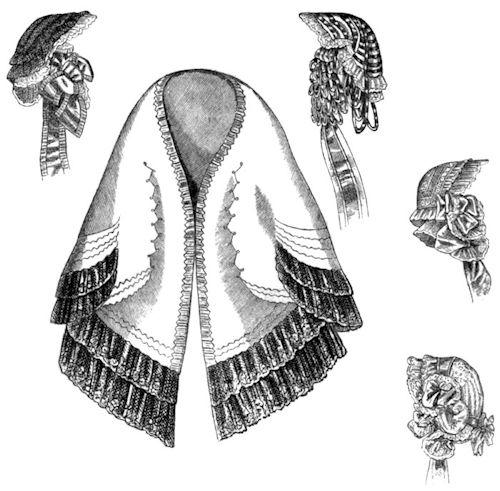 Illustration.—A charming morning dress is thus formed: a dress of barège, of silk pattern, with three volants trimmed with a small quilling à la vieille, and open in front, displaying a lace trimmed neckerchief, (Mechlin lace,) while two small volants finish the sleeves; the last surmounted by a quilling similar to that of the body of the dress.