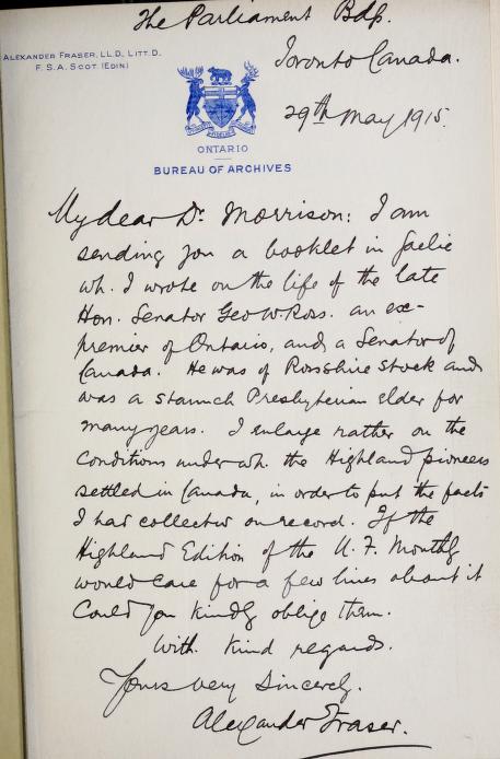 The following letter accompanied the copy sent by Alexander Fraser to Dr. Huw Morrison, whose Gaelic library now forms the Morrison Collection at the National Library of Scotland.