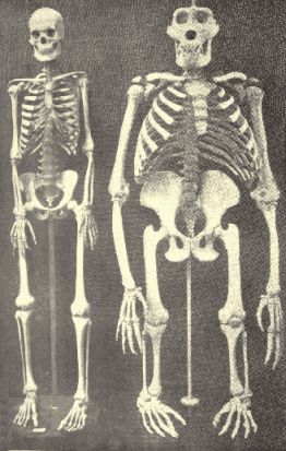 The Gorilla is the largest, strongest, and most formidable of the Primates. An adult male is from 5 feet 8 inches to 6 feet high, heavily built, with arms and chest of extraordinary power. The arms reach to the middle of the legs. The hands are clumsy, the thumb short, and the fingers joined by a web. The neck scarcely exists. The leg has a slight calf. The toes are stumpy and thick; the great toe moves like a thumb. The head is large and receding, with enormous ridges above the eyes, which give it a diabolical appearance. The canine teeth are developed into huge tusks. The nose has a long bridge, and the nostrils look downwards. The ear is small and man-like.