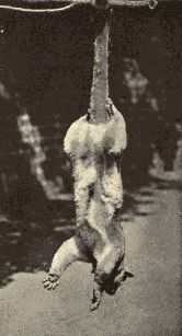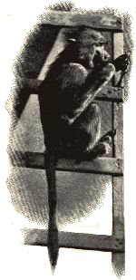The Entellus Monkey is the most sacred of all in India. It is gray above and nutty brown below, long-legged and active, a thief and an impudent robber. In one of the Indian cities they became such a nuisance that the faithful determined to catch and send away some hundreds. This was done, and the holy monkeys were deported in covered carts, and released many miles off. But the monkeys were too clever. Having thoroughly enjoyed their ride, they all refused to part with the carts, and, hopping and grimacing, came leaping all the way back beside them to the city, grateful for their outing. One city obtained leave to kill the monkeys; but the next city then sued them for "killing their deceased ancestors." In these monkey-infested cities, if one man wishes to spite another, he throws a few handfuls of rice on to the roof of his house about the rainy season. The monkeys come, find the rice, and quietly lift off many of the tiles and throw them away, seeking more rice in the interstices.