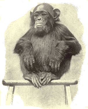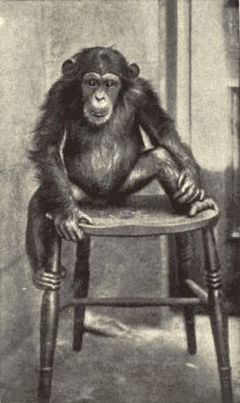 In captivity it is docile and intelligent, but usually fails to stand a northern climate for more than a few months. It is easily taught to wear clothes, to eat and drink in civilised fashion, to understand what is said to it, and reply with a limited vocabulary of grunts. Sally learnt to count perfectly up to six, and less perfectly to ten; she could also distinguish white from any colour, but if other colours were presented her she failed, apparently from colour-blindness. Of this ape the late Dr. G. J. Romanes wrote with something more than the enthusiasm of a clever man pursuing a favourite theme: "Her intelligence was conspicuously displayed by the remarkable degree in which she was able to understand the meaning of spoken language—a degree fully equal to that presented by an infant a few months before emerging from infancy, and therefore higher than that which is presented by any brute, so far at least as I have evidence to show." Romanes here speaks only, be it noticed, of ability to understand human speech—not to think and act. But this is in itself a great mark of intelligence on human lines. "Having enlisted the cooperation of the keepers, I requested them to ask the ape repeatedly for one straw, two straws, three straws. These she was to pick up and hand out from among the litter of her cage. No constant order was to be observed in making these requests; but whenever she handed a number not asked for her offer was to be refused, while if she gave the proper number her offer was to be accepted, and she was to receive a piece of fruit in payment. In this way the ape had learnt to associate these three numbers with the names. As soon as the animal understood what was required, she never failed to give the number of straws asked for. Her education was then completed in a similar manner from three to four, and from four to five straws. Sally rarely made mistakes up to that number; but above five, and up to ten, to which one of the keepers endeavoured to advance her education, the result is uncertain. It is evident that she understands the words seven, eight, nine, and ten to betoken numbers higher than those below them. When she was asked for any number above six, she always gave some number over six and under ten. She sometimes doubled over a straw to make it present two ends, and was supposed (thus) to hasten the attainment of her task." By no means all the chimpanzees are so patient as Sally. One kept in the Zoological Gardens for some time made an incessant noise by stamping on the back of the box in which it was confined. It struck this with the flat of its foot while hanging to the cross-bar or perch, and made a prodigious din. This seems to bear out the stories of chimpanzees assembling and drumming on logs in the Central African forests.
