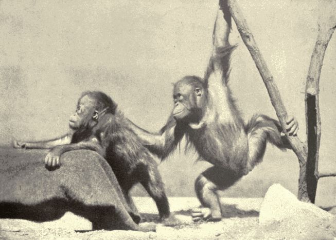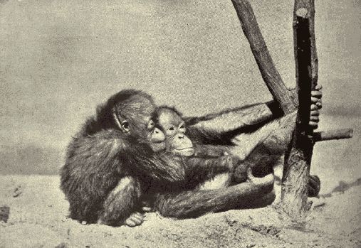 In captivity young orangs are playful and docile, but passionate. Less intelligent than chimpanzees, they may be taught to eat and drink nicely, and to obey simple commands. One in the Zoo at present has acquired the rudiments of drill. They will eat meat and eggs, and drink wine, beer, spirits, and tea. An orang described years ago by Dr. Clarke Abel was allowed the run of the ship on the voyage to England, and would play with the sailors in the rigging. When refused food he pretended to commit suicide, and rushed over the side, only to be found under the chains.