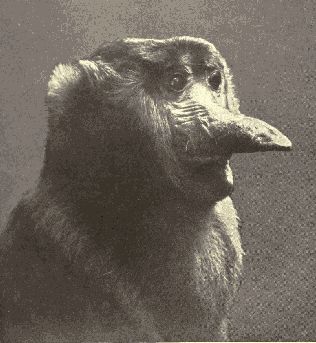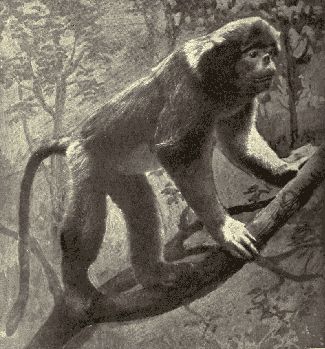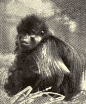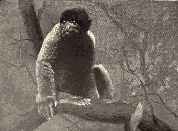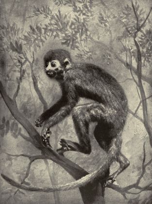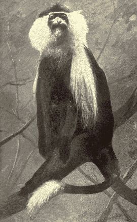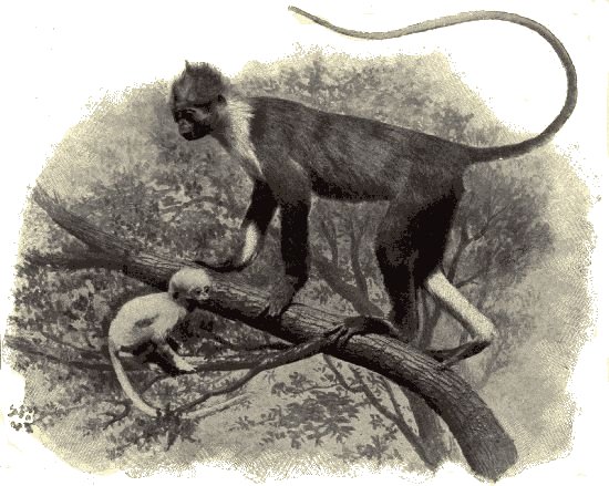 From India to Ceylon is no great way, yet in the latter island different monkeys are found. The two best known are the White-bearded Wanderoo Monkey and the Great Wanderoo. Both are grave, well-behaved monkeys. The former has white whiskers and a white beard, and looks so wise he is called in Latin Nestor, after the ancient counsellor of the Greeks. Nice, clean little monkeys are these, and pretty pets. The great wanderoo is rarer. It lives in the hills. "A flock of them," says Mr. Dallas, "will take possession of a palm-grove, and so well can they conceal themselves in the leaves that the whole party become invisible. The presence of a dog excites their irresistible curiosity, and in order to watch his movements they never fail to betray themselves. They may be seen congregated on the roof of a native hut. Some years ago the child of a European clergyman, having been left on the ground by a nurse, was bitten and teased to death by them. These monkeys have only one wife." Near relatives of the langurs are the two species of Snub-nosed Monkeys, one of which (see figure here) inhabits Eastern Tibet and Northwestern China, and the other the valley of the Mekong.