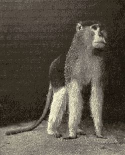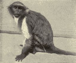 Among the ordinary monkeys of the Old World are some with very striking hair and colours. The Guereza of Abyssinia has bright white and black fur, with long white fringes on the sides. This is the black-and-white skin fastened by the Abyssinians to their shields, and, if we are not wrong, by the Kaffirs also. Among the Guenons, a large tribe of monkeys living in the African forests, many of which find their way here as "organ monkeys," is the Diana, a most beautiful creature, living on the Guinea Coast. It has a white crescent on its forehead, bluish-gray fur, a white beard, and a patch of brilliant chestnut on the back, the belly white and orange. A lady, Mrs. Bowditch, gives the following account of a Diana monkey on board ship. It jumped on to her shoulder, stared into her face, and then made friends, seated itself on her knees, and carefully examined her hands. "He then tried to pull off my rings, when I gave him some biscuits, and making a bed for him with my handkerchief he then settled himself comfortably to sleep; and from that moment we were sworn allies. When mischievous, he was often banished to a hen-coop. Much more effect was produced by taking him in sight of the panther, who always seemed most willing to devour him. On these occasions I held him by the tail before the cage; but long before I reached it, knowing where he was going, he pretended to be dead. His eyes were closed quite fast, and every limb was as stiff as though there were no life in him. When taken away, he would open one eye a little, to see whereabouts he might be; but if he caught sight of the panther's cage it was instantly closed, and he became as stiff as before." This monkey stole the men's knives, tools, and handkerchiefs, and even their caps, which he threw into the sea. He would carefully feed the parrots, chewing up biscuit and presenting them the bits; and he caught another small monkey and painted it black! Altogether, he must have enlivened the voyage. The Grivet Monkey, the Green Monkey, the Mona Monkey, and the Mangabey are other commonly seen African species.