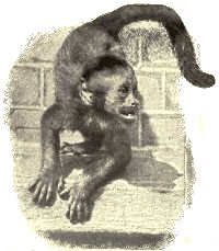 The Capuchins are, in the writer's opinion, the nicest of all monkeys. Many species are known, but all have the same round merry faces, bright eyes, pretty fur, and long tails. There is always a fair number at the Zoological Gardens. They are merry, but full of fads. One hates children and loves ladies; another adores one or two other monkeys, and screams at the rest. All are fond of insects as well as of fruit. A friend of the writer kept one in a large house in Leicestershire. It was not very good-tempered, but most amusing, climbing up the blind-cord first, and catching and eating the flies on the window-panes most dexterously, always avoiding the wasps. This monkey was taught to put out a lighted paper (a useful accomplishment) by dashing its hands on to the burning part, or, if the paper were twisted up, by taking the unlighted end and beating the burning part on the ground; and it was very fond of turning the leaves of any large book. This it did not only by vigorous use of both arms and hands, but by putting its head under too, and "heaving" the leaves over.