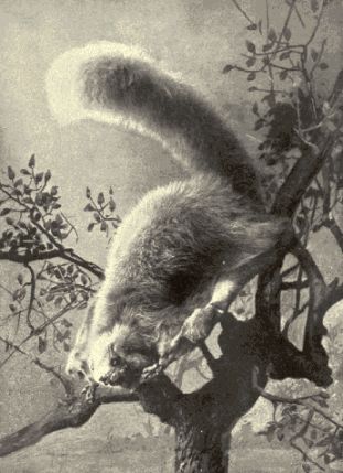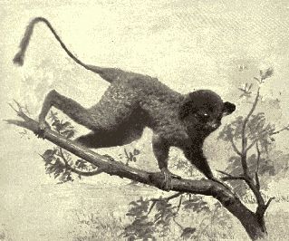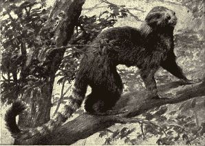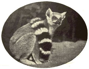 The South American monkeys, with their squirrel-like forms and fur, are followed by a beautiful and interesting group of creatures, called the Lemurs, with their cousins the Lorises, Maholis, and Pottos. Their resemblance to monkeys is mainly in their hands and feet. These are real and very highly developed hands, with proper thumbs. The second toe on the hind foot nearly always terminates in a long, sharp claw. "Elia," the Indian naturalist, who kept them as pets noticed that they used this to scratch themselves with. Some of them have the finger-tips expanded into a sensitive disk, full of extra nerves. Lemur means "ghost." Unlike the lively squirrels and monkeys, they do not leave their hiding-places till the tropical darkness has fallen on the forest, when they seek their food, not by descending to the ground, but by ascending to the upper surface of the ocean of trees, and again, at the first approach of dawn, seek refuge from the light in the recesses of some dark and hollow trunk. The Ring-tailed Lemur is as lively by day as night; but most of the race are so entirely creatures of darkness that the light seems to stupefy them. When wakened, they turn over like sleeping children, with the same inarticulate cries and deep, uneasy sighs. But at night most are astonishingly active; they fly from tree to tree, heard, but invisible; so that the natives of Madagascar doubt whether they are not true lemures, the unquiet ghosts of their departed dead.