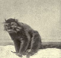 In the private room behind the monkey-house at the Zoo there are always a number of the rare and delicate monkeys from America, which cannot stand the draughts of the outer house, like the Capuchins and spider monkeys. The greater number of these come from tropical America. There, in the mighty forests, so lofty that no man can climb the trees, so dense that there is a kind of upper story on the interlaced tree-tops, where nearly all the birds and many mammals live without descending to earth, forests in which there is neither summer nor winter, but only the changes from hour to hour of the equatorial day, the exquisite Marmosets, whose fur looks like the plumage and whose twittering voices imitate the notes of birds, live and have their being. They are all much alike in shape, except that the Lion Marmoset's mane is like that of a little lion clad in floss silk; and they all have sharp little claws, and feed on insects. The Pinché Marmoset from the Guiana forests has a face like a black Indian chief, with white plumes over his head and neck like those worn by a "brave" in full war-paint. Merchants who do business with Brazil very frequently import marmosets and the closely allied tamarins as presents for friends at home in England; the Brazilians themselves like to have them as pets also; so there is to some extent a trade demand for them.