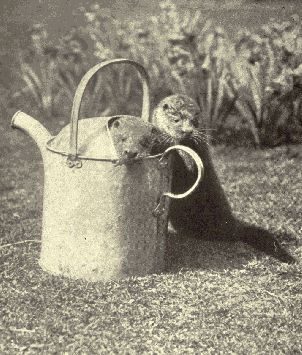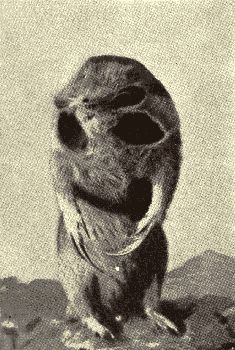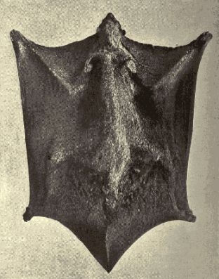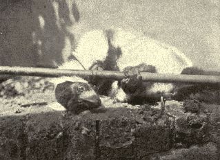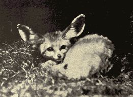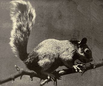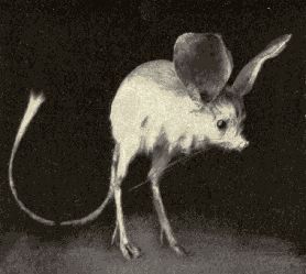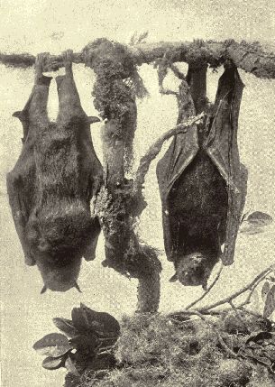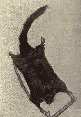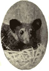 In the Malay islands a distant relative, even more curiously formed, is found in the Tarsier. It has the huge eyes, pointed ears, and beautiful fur of the galagos, but the tail is long, thin and tufted. The fingers are flattened out into disks, like a tree-frog's. These creatures hop from bough to bough in a frog-like manner in search of insects. They are not so large as a good-sized rat. Our photograph does not give an adequate idea of the size of the eyes.