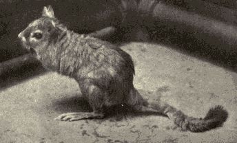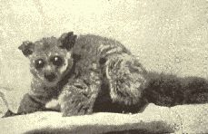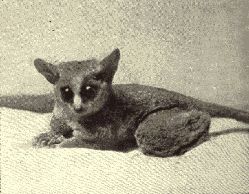 An allied group, confined to tropical Africa, is that of the Galagos. They are most beautiful little creatures, whose nearest relatives are the Malagasy lemurs. Generally speaking, they have even more exquisite fur than the lemurs. It is almost as soft as floss silk, and so close that the hand sinks into it as into a bed of moss. The colour of the fur is rich and pleasing, generally some shade of brown. The head is small, the nose pointed, and the ears thin, hairless, and capable of being folded up, like the wings of a beetle. But the most beautiful feature of the galagos is their eyes. These are of immense size, compared with the head. The eye is of the richest and most beautiful brown, like a cairngorm stone, but not glassy or clear. Though quite translucent, the eye is marked with minute dividing-lines, like the grain in an agate—a truly exquisite object. When handled or taken in the arms, the little galago clasps the fingers or sleeve tightly, as if it thought it was holding a tree, and shows no disposition to escape. A family of three or four young ones, no larger than mice, with their large-eyed mother attending to them, forms an exquisitely dainty little group. The galagos vary from the size of a squirrel to that of a small cat. The kind most often seen in England is the Maholi Galago from East Africa. Another species comes from Senegal, and others from Calabar and the forests of the Gold Coast. Garnett's Galago, another species, is shown above. They may be regarded as nocturnal tropical lemuroids, analogous to the chirogales of Madagascar. It has been suggested, with great probability, that the intensely drowsy sleep of many of the lemuroid animals corresponds to the hibernation of many northern mammals. Tropical animals often become torpid to avoid the famine caused by the hot season, just as creatures in cold countries hibernate to avoid the hunger which would otherwise come with winter.
