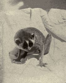 The Slow Loris is found in Eastern India and the Malay countries, where it is fairly common in the forests. The Bengali natives call it sharmindi billi ("bashful cat"), from its slow, solemn, hesitating movements when in pursuit of insects. Of a slow loris kept by him, Sir William Jones, in the "Asiatic Researches," wrote: "At all times he seemed pleased at being stroked on the head and throat, and he frequently allowed me to touch his extremely sharp teeth. But his temper was always quick, and when he was unseasonably disturbed he expressed a little resentment, by an obscure murmur, like that of a squirrel. . . . When a grasshopper or any insect alighted within his reach, his eyes, as he fixed them on his prey, glowed with uncommon fire; and having drawn himself back to spring on his prey with greater force, he seized it with both his fore paws, and held it till he had devoured it. He never could have enough grasshoppers, and spent the whole night in prowling for them."