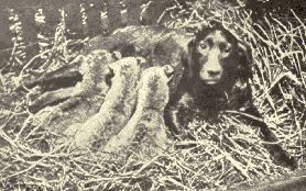 They are the only mammals which thoroughly understand combination for defense as well as attack. But Brehm, the German traveler, gives a charming story of genuine courage and self-sacrifice shown by one. His hunting dogs gave chase to a troop which was retreating to some cliffs, and cut off a very young one, which ran up on to a rock, only just out of reach of the dogs. An old male baboon saw this, and came along to the rescue. Slowly and deliberately he descended, crossed the open space, and stamping his hands on the ground, showing his teeth, and backed by the furious barks of the rest of the baboons, he disconcerted and cowed these savage dogs, climbed on to the rock, picked up the baby, and carried him back safely. If the dogs had attacked the old patriarch, his tribe would probably have helped him. Burchell, the naturalist after whom Burchell's zebra is named, let his dogs chase a troop. The baboons turned on them, killed one on the spot by biting through the great blood-vessels of the neck, and laid bare the ribs of another. The Cape Dutch in the Old Colony would rather let their dogs bait a lion than a troop of baboons. The rescue of the infant chacma which Brehm saw himself is a remarkable, and indeed the most incontestable, instance of the exhibition of courage and self-sacrifice by a male animal.