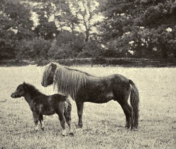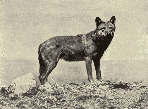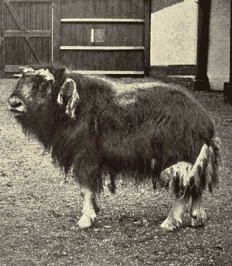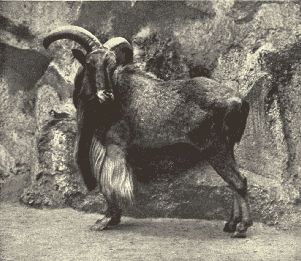 The Tahr of the Himalaya is a very different-looking animal to the true goats, from which, among other characters, it is distinguished by the form and small size of the horns. The horns, which are black, spring in a high backward arch, but the creature has no beard. A buck stands sometimes as much as 38 inches high at the shoulder. It has a long, rough coat, mainly dark stone colour in tint.