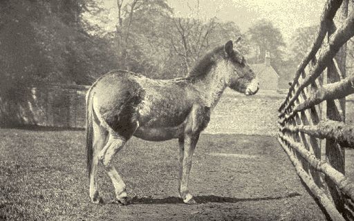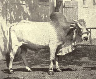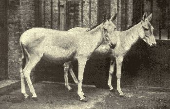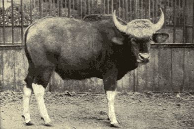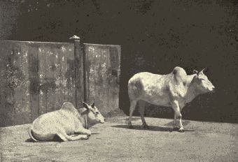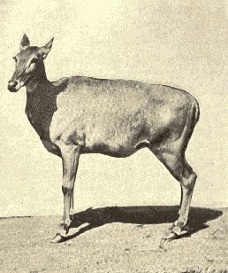 The Nilgai, or Blue Bull, is an inhabitant of India, and is found throughout the greater portion of the peninsula, from the base of the Himalaya to the south of Mysore. It is an animal of large size, standing about 4 feet 6 inches at the shoulder. In general colour the male is of a dark iron-grey, the female tawny fawn. White spots on the cheeks and just above the hoofs on the fore and hind feet are the outward signs of its affinity to the African harnessed antelopes. The male alone carries horns, which are nearly straight and very small for the size of the animal, rarely exceeding 9 inches in length.