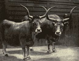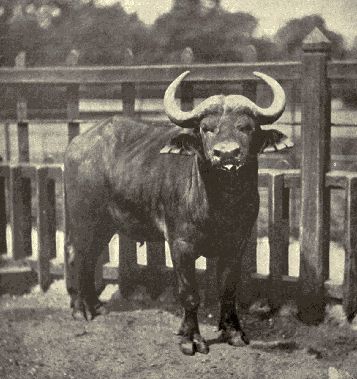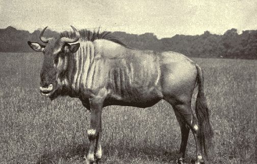 The gnus are of large size, and at first sight appear to have the head of a buffalo, the tail of a horse, and the limbs and hoofs of an antelope. Their heads are very massive, with broad muzzles and widely separated, hairy nostrils; their necks are maned, tails long and bushy, and both sexes carry horns. They are known as "wilde beeste," or "wild cattle," to the Dutch colonists of South Africa.