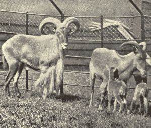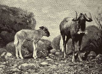 This is a large wild sheep of the North African highlands. The old rams have a very fine appearance, with a long flowing beard or mane, and large horns. These wild sheep, though somewhat goat-like in appearance, are typical of their race in general habits. They live in the Atlas Range, and in the splendid heights of the Aures Mountains, which lie at the back of Algeria and fringe the great Sahara Desert. In the isolated and burning rocks which jut up in the desert itself into single mountains they are also found, living on ground which seems absolutely destitute of water, grass, or vegetation. They live singly or in small families; but the rams keep mainly alone. Sometimes they lie in shallow caves during the heat of the day. These caves smell like a sheep-fold. More generally the sheep repose on some shelf of rock, where they exactly match the colour of the stone, and are invisible. The ground is among the most difficult in which any hunting is attempted, except perhaps in chamois stalking; but the pursuit seems to fascinate sportsmen. Mr. A. E. Pease recently gave some charming descriptions of the silence, the rugged rocks, and the astonishing views over the great orange Sahara Desert seen from the tops of these haunts of the Barbary sheep—mountains on the summits of which his Arab guides would prostrate themselves in evening prayer as the sun sank over the desert, and then, rising, once more resume the chase. The young lambs of the Barbary sheep are charming little creatures, more like reddish kids. They can follow the mother over the steepest ground at a great pace. When caught, as they sometimes are by the Arabs, they soon become tame. The tail is longer than in other wild sheep, and in the males a large mane covers the chest.