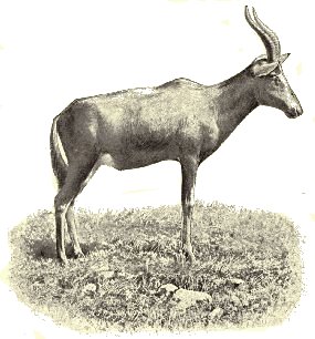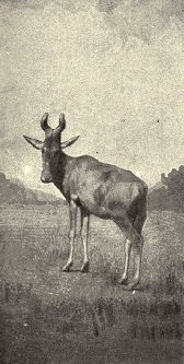 All the hartebeests have a strong family resemblance, and are very similar in their habits. They are never found either in dense forests or in swampy or mountainous country, but are inhabitants of the arid deserts of Northern and South-western Africa, and of the open grassy plains and thinly forested regions of the high plateaux of the interior of that continent. They are extraordinarily fleet and enduring, and in my own experience I have never heard of one of these animals, of whatever species, having been overtaken or ridden to a standstill by a man on horseback. They are very inquisitive, and where they have not been molested will allow any unaccustomed object—such as a European in clothes—to walk to within easy shot of them before running off. They soon gain experience, however; and in countries where they have been most persecuted hartebeests are the keenest-sighted and the most wary of all African game. They are very fond of climbing to the top of the large ant-heaps with which the plains of Africa are profusely studded, and from this point of vantage surveying the surrounding country. They live, I believe, entirely upon grass, and in the desert areas of their range seem able to subsist for long periods without drinking water. Their meat I have always thought very palatable. They are generally in fairly good condition, though they seldom carry much fat. Their fat, after being melted, becomes solid again immediately on cooling, and clogs on the teeth whilst being eaten. But very few African species, except the eland, ever become really fat; their life is too active, and the food-supply too uncertain, for them to put on flesh like European deer.