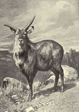 The largest animals in the first of three groups now to be considered are the Waterbucks, antelopes of stout and sturdy build, standing from 45 to 50 inches at the shoulder, and covered with long, coarse hair, especially on the neck, in both sexes. The males alone carry horns, which vary from 20 to 36 inches in length, and are strongly ringed in front for three-fourths of their length. They are sublyrate in shape, being first inclined backwards and then forwards at the tips. There are three well-marked species of waterbuck—viz. the Common Waterbuck of South Africa, whose range extends from the Limpopo northwards, through Nyasaland to German and British East Africa, and to the Shebeyli River, in Somaliland; the Sing-sing of Senegal and Gambia; and the Defassa Waterbuck of Western Abyssinia and the Nile Valley, south to Uganda and British and German East Africa. In habits all species of waterbuck are very similar. They live generally, though not invariably, in herds of from ten to twenty individuals, and in such small herds there is seldom more than one full-grown male present. In the interior of South Africa the waterbuck is often met with amongst steep stony hills and at a distance of more than a mile from the nearest river. Speaking generally, however, this antelope may be said to frequent the near neighbourhood of water, but to prefer dry to swampy ground. When chased by dogs it always makes for water, and will plunge fearlessly into broad, deep rivers, regardless of crocodiles, to which ravenous reptiles it sometimes falls a victim. In South Africa waterbuck vary much in colour even in the same district, some being reddish brown, whilst others are of a very dark grey. The flesh of the waterbuck is coarse, and sometimes rather strongly tasted, and when in good condition the fat is very hard.