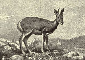 In height the klipspringer stands about 1 foot 9 inches at the shoulder. The males alone carry horns, which are straight and ringed at the base, and vary from 3 to 5 inches in length. The coat is of a greeny yellow-brown colour, with the hairs hollow and brittle. These little animals are usually met with singly, or in twos and threes together. When caught young, they become wonderfully tame, and make the most charming pets, being very playful and fond of jumping, with surprising ease and grace, from the floor of a room on to any elevated position, such as a table, mantelpiece, or window-sill.