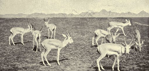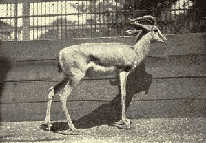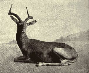 This handsome species is found throughout India wherever there are open cultivated plains. The male stands about 32 inches at the shoulder, and when full grown is of a glossy black colour, with the exception of a chestnut-coloured patch at the back of the neck, and some markings of the same colour about the face. The belly and insides of the limbs are pure white, the line between the black and white being very clearly defined. The whole body and frame are very compact, strong, and beautifully proportioned, and the head is carried high. The males alone carry horns, which are spiral in shape, annulated almost to the tips, and vary in length from 18 to 28 inches. Young bucks and does are fawn-coloured instead of black. These antelopes are usually met with in considerable herds on open plains in which cultivated tracts alternate with waste land, and they often do much damage to the natives' crops. When alarmed, they first execute a series of prodigious bounds into the air before finally settling down to a steady run. They are surprisingly fleet, and can seldom be overtaken by the fastest greyhounds, although they can be caught and pulled down without difficulty by trained cheetas, or, as they are often called, hunting-leopards.