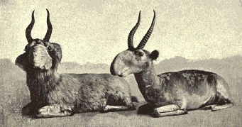 This curious-looking animal, which is chiefly remarkable for its large swollen-looking nose and light-coloured horns, is an inhabitant of the steppes of the South-eastern Europe and Western Asia. In height it stands about 30 inches at the withers, and is of a dull yellowish colour in summer, turning to nearly white in winter. The males alone carry horns, which are sometimes 13 or 14 inches long, and of a peculiar colour which has been likened to pale amber.