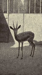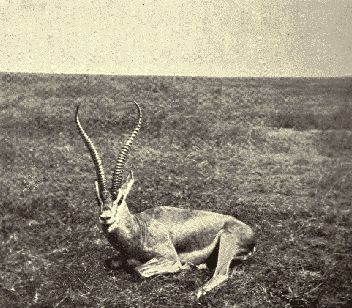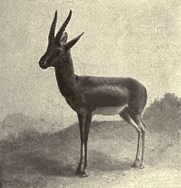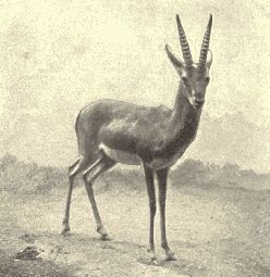 Of the whole genus Grant's Gazelle is the most beautiful. This handsome animal, which was first discovered by the explorers Speke and Grant in 1860, is an inhabitant of Eastern Africa, from the neighbourhood of Lake Rudolph southwards to Ugogo. In size the average height at the shoulder of males of this species is about 34 inches. The coat is close and short and of a general fawn colour, the rump and belly pure white, and the face marked with a rufous band from the horns to the nose and with streaks of white on each side. The upper surface of the tail is white, with a black and tufted tip. The horns, which are very elegant in shape, being first curved slightly forwards and then backwards, are much longer and more powerful than in any other gazelle, and attain a length of 30 inches in the males and 17 inches in the females.