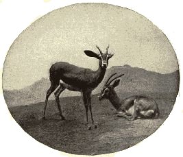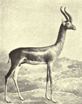 On the sandy plains of North-western Africa are found the Red-fronted Gazelle of Senegal and Gambia; the little-known Mhorr Gazelle of South-western Morocco; and the Dama Gazelle, a species which has been known to naturalists ever since the time of Buffon. A near ally of the last-named animal is the Red-necked Gazelle of Dongola and Senaar. In North-eastern Africa are found the large and handsome Soemmerring's Gazelle; the Isabella Gazelle, of the coastlands of the Red Sea; Heuglin's Gazelle; Pelzeln's Gazelle, of the maritime plains of Northern Somaliland; and Speke's Gazelle, of the interior of the same country; whilst farther south the group is represented by the large and beautiful Grant's Gazelle, with its allies Peters's Gazelle and Thomson's Gazelle. The well-known Dorcas Gazelle is an inhabitant of Morocco and Algeria, ranging through Egypt into Palestine and Syria; the Marica Gazelle, the Muscat Gazelle, and the Arabian Gazelle inhabit the deserts of Arabia; the Edmi Gazelle is found in the mountain-ranges of Morocco, Algeria, and Tunis; while Loder's Gazelle inhabits the sandy tracts of the interior of Algeria and Tunis. In Asia, besides the four species of gazelle already enumerated in which the females are hornless, one other member of the group is met with. This is the Indian Gazelle, a species very closely allied to the Arabian form.