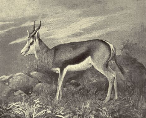 The nearest ally of the true gazelles is undoubtedly the Springbuck of South Africa. Owing to the protection which it has received of late years, this graceful antelope is now a common animal in many parts of South Africa, and in the north-western portions of the Cape Colony still sometimes collects into prodigious herds, which travel through the country in dense masses, destroying every vestige of grass on the line of their advance, and causing considerable anxiety to farmers, whose flocks of sheep and goats are sometimes swept away by the migrating springbucks. In former years the migration of these antelopes in countless thousands from the deserts of Namaqualand to the countries farther south was a common occurrence, an unerring instinct guiding the wandering herds to districts where rain had lately fallen and caused a new growth of green grass. The animals composing these migrating herds were called by the Dutch settlers of the Cape Colony "Trekbokken," or "travelling-bucks."