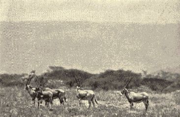 In habits all species of oryx seem to be very similar. They are denizens of the arid sun-scorched plains of Africa, which are not necessarily devoid of all kind of vegetation, but are often covered with stunted bush, and carry a plentiful crop of coarse grass after rain. Oryx usually run in herds of from four or five to fifteen or twenty, though the beisa, the most abundant of the group, has been met with in troops numbering 400 or 500 head. All the oryx are shy and wary, and in the open country they usually frequent are difficult to approach on foot. If pursued on horseback, they run at a steady gallop, which they can maintain for long distances, swinging their bushy black tails from side to side, and holding their heads in such a way that their long straight horns are only sloped slightly backwards. Fleet and enduring, however, as oryx undoubtedly are, I am of opinion that in these respects the gemsbuck of South Africa, at any rate, is inferior to all other large antelopes living in the same country, with the single exception of the eland. I have often, when mounted on a fast horse, galloped right up to herds of gemsbuck, and on two occasions have run antelopes of this species to an absolute standstill. Oryx of all species should be approached with caution when badly wounded, as they are liable to make short rushes, and can use their horns with great effect.