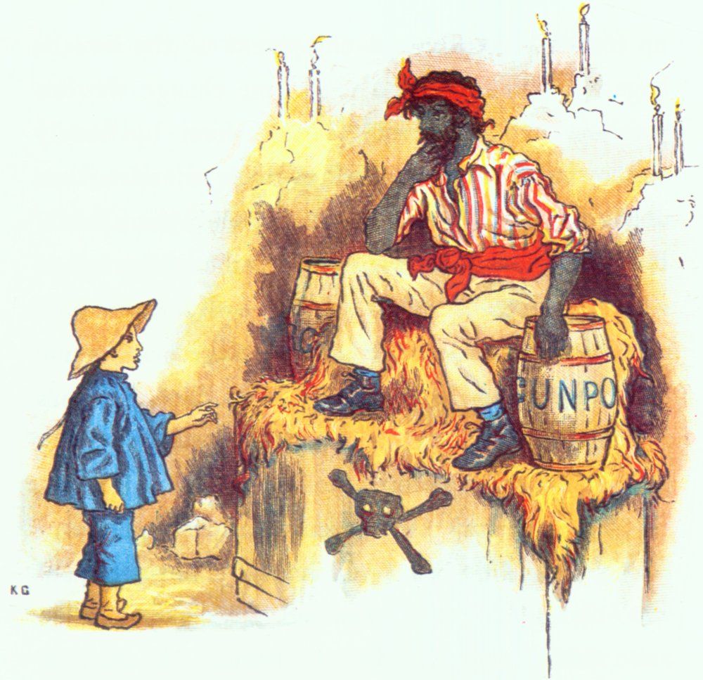"Enough. Bring refreshments. Will Your Majesty prefer winter-green, peppermint, rose, or accidulated drops? Red or white? Or perhaps Your Majesty will let me recommend these bull's eyes," said the leader, as a collection of sweets in a hat were suddenly produced from the barrel labelled "Gunpowder" and handed to the children.