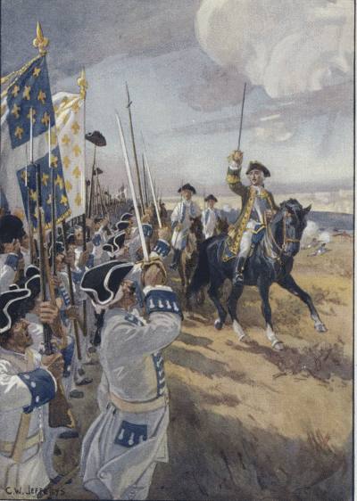 Montcalm's second war was the War of the Austrian Succession, a war in which his younger opponent Wolfe saw active service for the first time. The two future opponents in Canada never met, however, on the same battlefields in Europe. In 1741, the year in which Wolfe received his first commission, Montcalm fought so well in Bohemia that he was made a Knight of St Louis. Two years later, at the age of thirty-one, he was promoted to the command of a regiment which he led through three severe campaigns in Italy. During the third campaign, in 1746, there was a terrific fight against the Austrians under the walls of Placentia. So furious was the Austrian attack that the French army was almost destroyed. Twice was Montcalm's regiment broken by sheer weight of numbers. But twice he rallied it and turned to face the enemy again. The third attack was the worst of all. Montcalm still fought on, though 9 already he had three bullet wounds, when the Austrian cavalry made a dashing charge and swept the French off the field altogether. He met them, sword in hand, as dauntless as ever; but he was caught in a whirlwind of sabre-cuts and was felled to the ground with two great gashes in his head. He was taken prisoner; but was soon allowed to go home, on giving his word of honour, or 'parole,' that he would take no further part in the war until some Austrian prisoner, of the same rank as his own, was given back by the French in exchange. While still on parole he was promoted to be a brigadier, so that he could command more than a single regiment. In due time, when proper exchange of prisoners was made, Montcalm went back to Italy, again fought splendidly, and again was badly wounded. The year 1748 closed with the Treaty of Aix-la-Chapelle; and seven years of peace followed before the renewed tumult of the Seven Years' War.