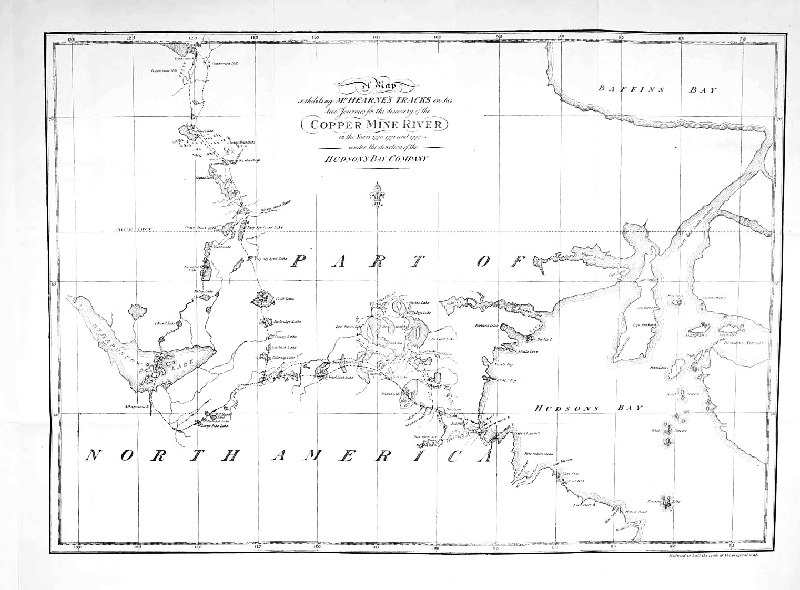 A MAP EXHIBITING Mr. HEARNE’S TRACKS IN HIS TWO JOURNIES FOR THE DISCOVERY OF THE COPPER MINE RIVER IN THE YEARS 1770, 1771, AND 1772, UNDER THE DIRECTION OF THE HUDSON’S BAY COMPANY
