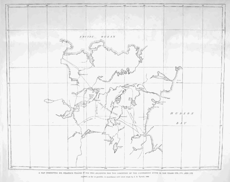 Hearne’s Journal, published after his early death, has become a rather rare book. Besides the narrative of what he did, it contains copious notes on the natural history of the region which he was the first white man to make known.[viii] A new edition has long been needed. Yet to secure competent editing was a difficult task, since few knew the remote country which Hearne explored. It may be regarded as fortunate that the new edition has been delayed, for only now are we able to present Hearne’s story with the annotations necessary to give it the last possible elucidation. The needed knowledge is supplied by Mr. J. B. Tyrrell and Mr. E. A. Preble, two writers pre-eminently suited for their task by journeys in the regions described by Hearne, on parts of which so few white men have set eyes.