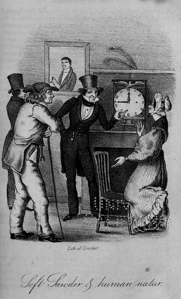 As the old gentleman closed the door after him, Mr. Slick drew near to me, and said in an under tone, that is what I call “soft sawder.” An Englishman would pass that man as a sheep passes a hog in a pasture, without looking at him; or, said he, looking rather archly, if he was mounted on a pretty smart horse, I guess he’d trot away, if he could. Now I find—Here his lecture on “soft sawder” was cut short by the entrance of Mrs. Flint. Jist come to say good bye, Mrs. Flint. What, have you sold all your clocks? Yes, and very low, too, for money is scarce, and I wished to close the concarn; no, I am wrong in saying all, for I have just one left. Neighbor Steel’s wife asked to have the refusal of it, but I guess I won’t sell it; I had but two of them, this one and the feller of it, that I sold Governor Lincoln. General Green, the Secretary of State for Maine said he’d give me 50 dollars for this here one—it has composition wheels and patent axles, it is a beautiful article—a real first chop—no mistake, genuine superfine, but I guess I’ll take it back; and beside, Squire Hawk might think kinder harder, that I did not give him the offer. Dear me said Mrs. Flint, I should like to see it, where is it? It is in a chest of mine over the way, at Tom Tape’s store, I guess he can ship it on to Eastport. That’s a good man, said Mrs. Flint, jist let’s look at it.