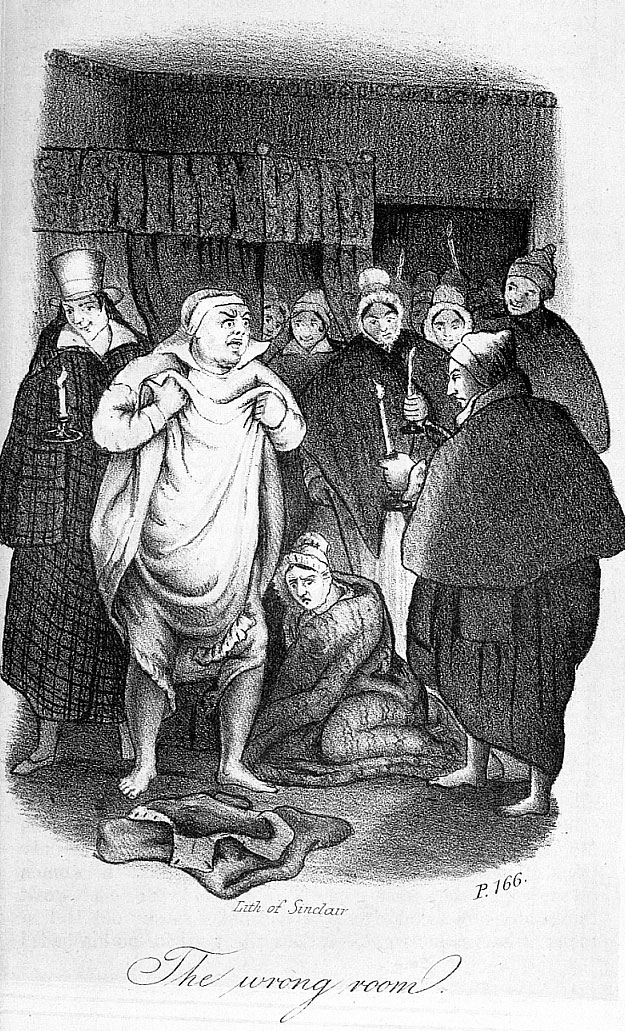 But ministers don’t know much of this world;—they may know the road to the next; but they don’t know the cross-roads and by-paths of this one—that’s a fact. But I was agoin’ to tell you what happened that day—I was stayin’ to Gineral Peep’s boardin’ house to Boston, to enjoy, as I was asayin’, the anniversary. There was an amazin’ crowd of folks there; the house was chock full of strangers. Well, there was a gentleman and a lady, one Major Ebenezer Sproul and his wife, aboardin’ there, that had one child, the most cryenest critter I ever seed; it boohood all night a’most, and the boarders said it must be sent up to the garret to the helps, for no soul could sleep a’most for it. Well, most every night Mrs. Sproul had to go up there to quiet the little varmint,—for it wouldn’t give over yellin’ for no one but her. That night, in partikelar, the critter screeched and screamed like Old Scratch; and at last Mrs. Sproul slipped on her dressin’ gownd, and went up stairs to it,—and left her door ajar, so as not to disturb her husband acomin’ back; and when she returned, she pushed the door open softly, and shot it to, and got into bed. He’s asleep, now, says she; I hope he won’t disturb me ag’in. No, I ain’t asleep, mynheer stranger, says old Zwicker, a Dutch merchant from Albany, (for she had got into the wrong room, and got in his bed by mistake,) nor I don’t dank you, nor Gineral Beep needer, for puddin’ you into my bed mid me, widout my leave nor lichense, nor abbrobation, needer. I liksh your place more better as your company? Oh, I got no gimblet! Het is jammer, it is a pity! Oh! dear, if she didn’t let go, it’s a pity; she kicked and screamed, and carried on like a ravin’ distracted bed-bug. Tousand teyvels, said he what ails te man? I believe he is pewitched. Murder! murder! said she, and she cried out at the very tip eend of her voice, murder! murder! Well, Zwicker, he jumped out o’ bed in an all-fired hurry, most properly frightened, you may depend; and seezin’ her dressin’ gownd, instead of his trousers, he put his legs into the arms of it, and was arunnin’ out of the room aholdin’ up of the skirts with his hands, as I came in with the candle. De ferry teyvil hisself is in te man, and in de trousher too, said he; for I pelieve te coat has grow’d to it in te night, it is so tam long. Oh, tear! what a pity. Stop, says I, Mister Zwicker, and I pulled him back by the gownd (I thought I should adied larfin’ to see him in his red night-cap, his eyes startin’ out o’ his head, and those short-legged trousers on, for the sleeves of the dressin’ gownd didn’t come further than his knees, with a great long tail to ’em.) Stop, says I, and tell us what all this everlastin’ hubbub is about: who’s dead and what’s to pay now?