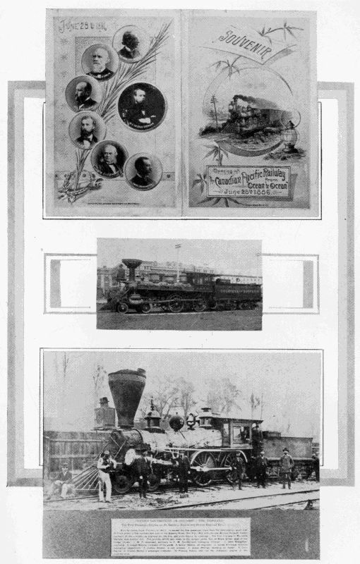 SOUVENIR OF THE DRIVING OF THE LAST SPIKE ON THE C.P.R.—THE FIRST C.P.R. LOCOMOTIVE—THE FIRST LOCOMOTIVE IN TORONTO.