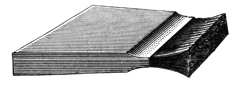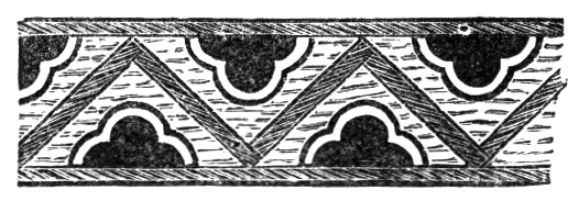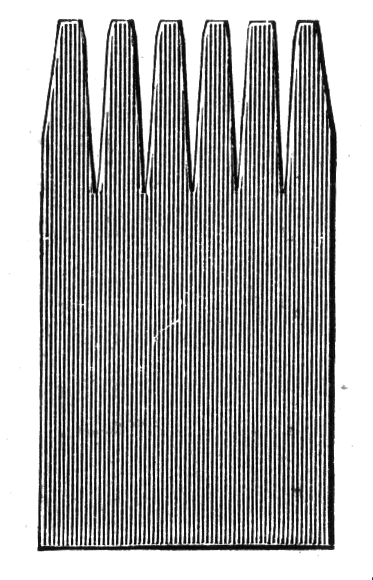 Combs also are of bone, leather, indiarubber, and cork, and the three last mentioned may be made by the grainer himself. A sound piece of stuff should be selected, about 1/8 in. thick and from 1 in. to 4 in. long, and the spaces to form the teeth, which should be of a suitable size, are cut out with a sharp chisel or penknife, the teeth being shaped like the letter V and not less than ¼ in. deep. In some of these combs the teeth are not cut very deeply into the material; they are mere notches, which can be deepened as the points wear away. Flexible combs give a soft effect, and make a cleaner combing than steel combs; although steel ones give sharpness and a broken effect to the lines, yet they are inclined 13 to leave a jagged edge. After the broad leather comb has done its work, the finer steel comb is used to cut and break up the colour. The lines in graining are always irregular. Fig. 3 illustrates a leather comb; this costs about the same as a steel one. Two or three of these, varying in size, should be obtained.