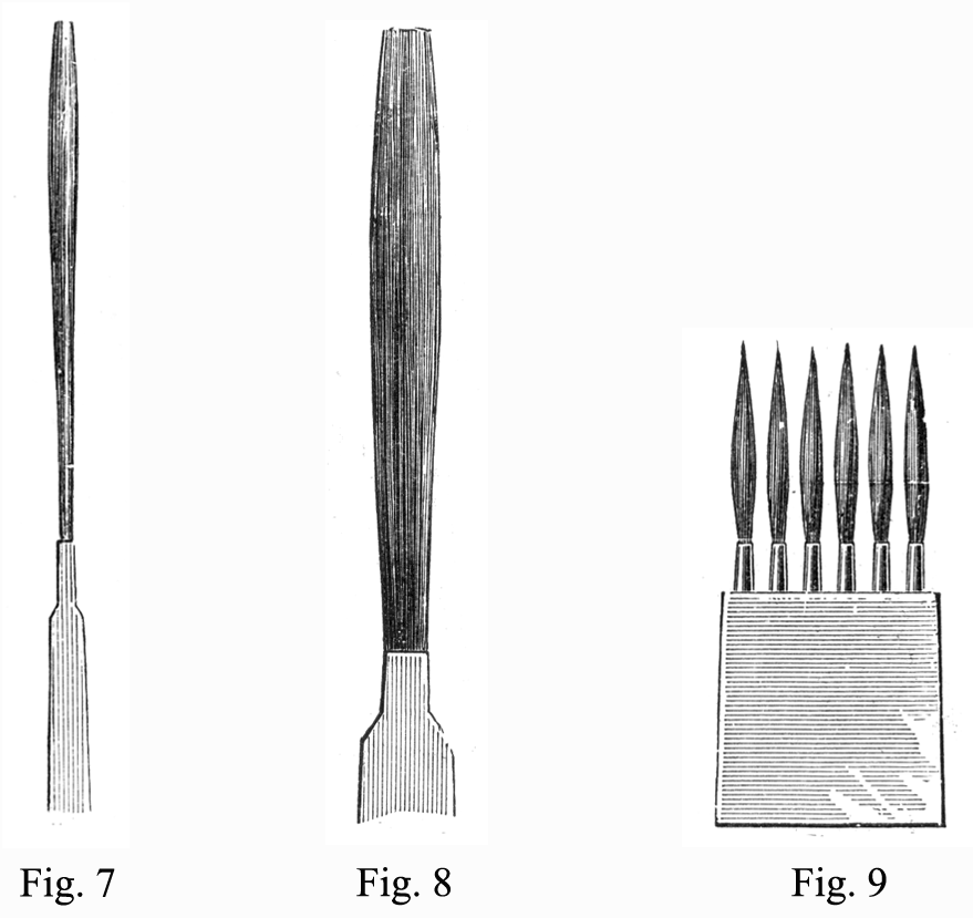 Two each of the kinds of overgrainers here illustrated will be suitable. Overgrainers for use in imitating oak are shown by Figs. 6, 7, 8; a sable overgrainer by Fig. 9, and a hog-hair overgrainer by Fig. 10.