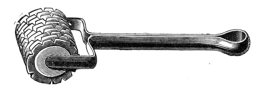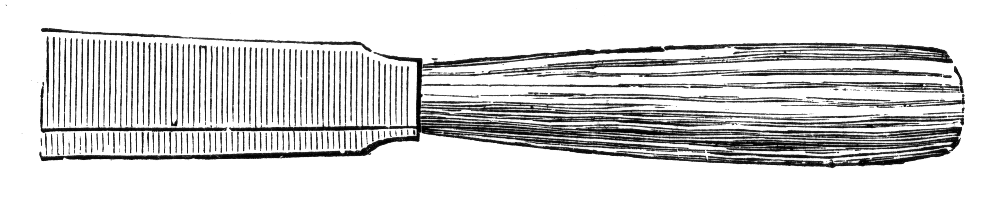 Mechanical aids in the hands of a skilful man are useful, but their tendency, so far as masters of the art are concerned, 18 is to fetter and hinder artistic production. A very useful mechanical help is the over-combing roller, by which are imitated the irregular markings characteristic of many woods. Oak combing rollers (Figs. 23 and 24) are the most serviceable of the mechanical aids. They have iron handles, in which are fitted the small axles on which the metal discs revolve. The discs usually are of sheet zinc, being stamped out in circular form, and afterwards notched around the circumference. Each of the discs is placed upon the axle, and they revolve loosely and independently of one another. Fig. 25, illustrates the feeding brush used with these rollers; a good substitute for this is a worn paint tool of a size between Nos. 9 and 12 (Fig. 26). When working with this roller, the oil graining colour is spread in the usual way, as will be described later on, and the lights and half-tones are wiped out. When dry, the grain is put on by using a thicker and darker graining colour. The feeding brush is charged with colour, and then held against the handle of the roller by the left hand, whilst the roller is held with the right hand. The two hands then cause the roller to travel along the surface of the work, the edges of the metal discs transmitting fine irregular lines. 19 Of course, in those places in which the lines have been wiped out, the pore lines made by the roller must be cleaned away with rag, whilst they must also be softened off lengthways with a badger or large dry tool. Care must be taken to obtain clean sharp rolling, which must also run at the natural angle of the grain. These rollers can be used with both distemper and oil colour. Different sized 20 rollers are used to give variety in the figure. It must be remembered that these rollers can be used as helps only; the work must be finished by hand.