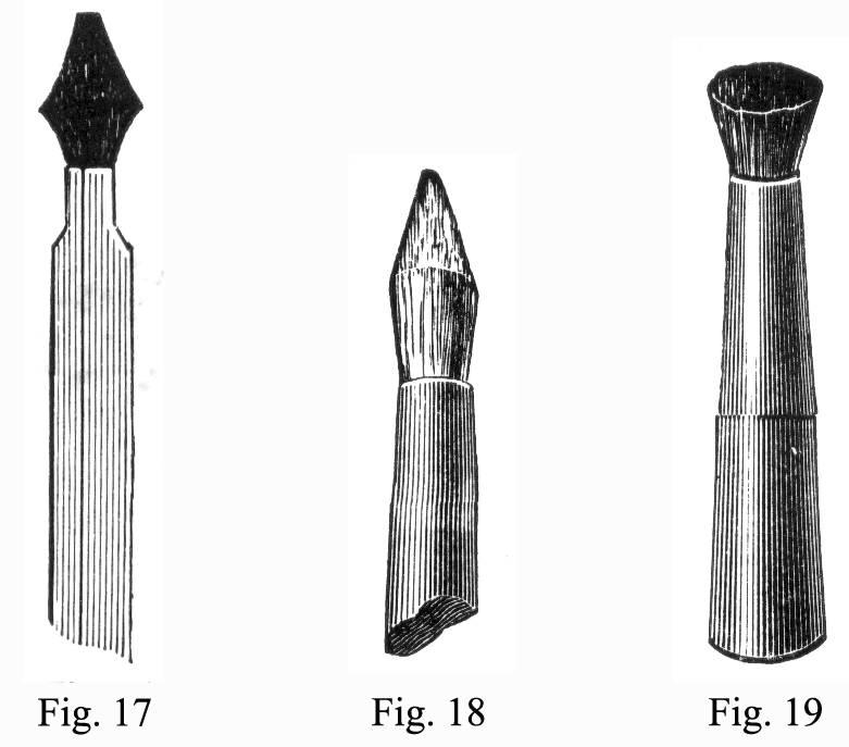 Mottlers differ from overgrainers in the fact that the latter are comparatively thin, whilst the former are thick. For some purposes a worn-down stumpy mottler is the best. Some mottlers are made of camel-hair for maple graining, and have a bevelled edge, but they are generally made of hog-hair. There are many kinds in use. Thin mottlers are illustrated by Figs. 11 and 12; medium and thick ones by Figs. 13, 14, and 15; and camel-hair mottlers by Figs. 16 and 17.