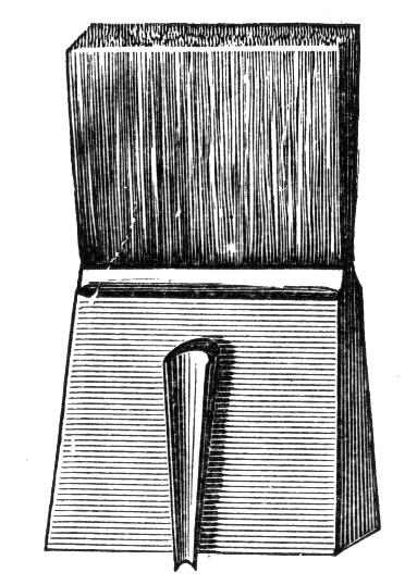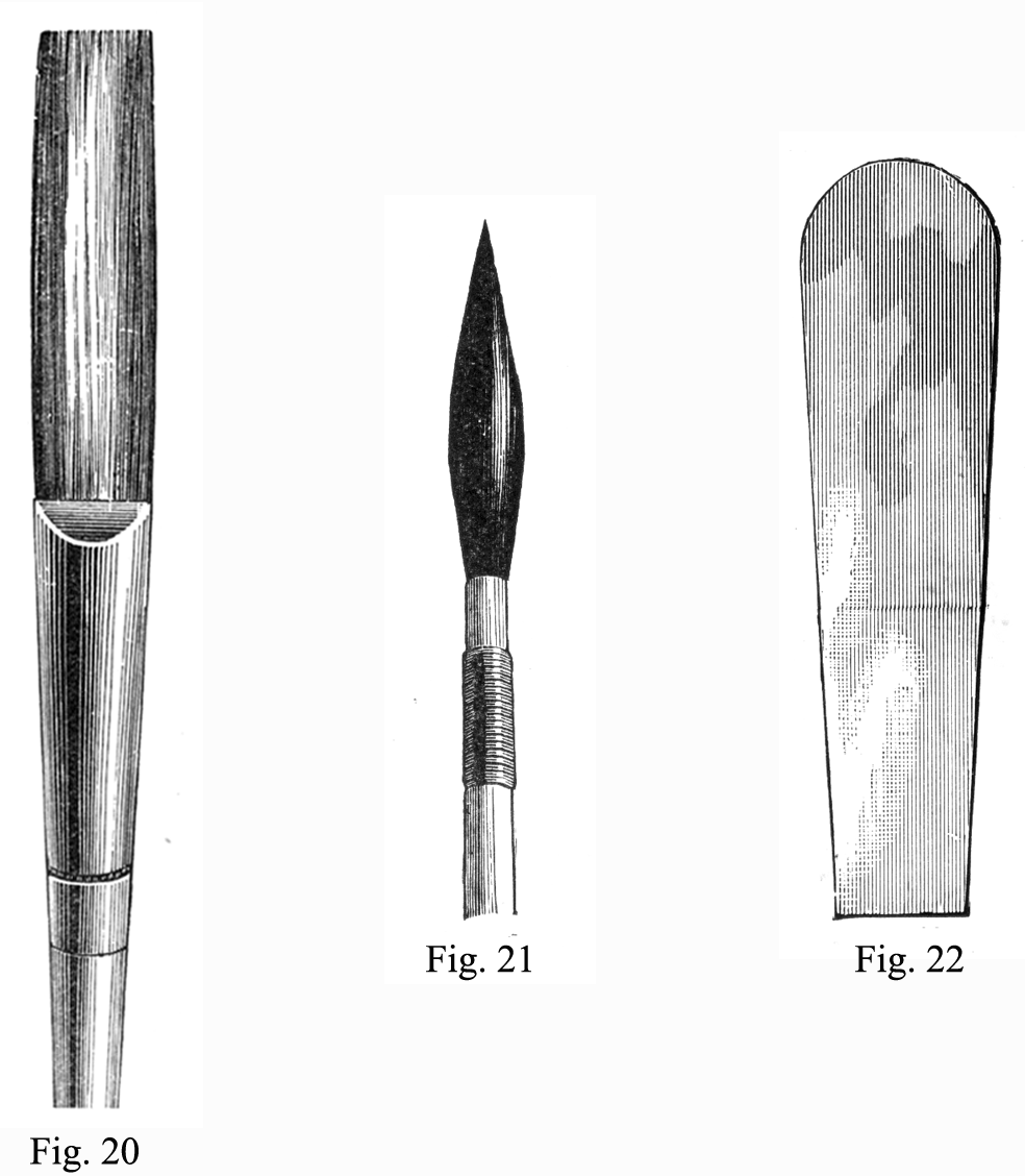 Other brushes that will be required are a maple-hair shader, Fig. 18; a dotter, Fig. 19; a veining fitch, Fig. 20; and a goose sable pencil, Fig. 21. Flat hog-hair fitches (Nos. 2, 6, and 9) will be required for figuring; old fitches are also useful. It is hardly necessary to add that in order to get a variety of effects a variety of tools is indispensable. The markings in oak often are done by means of a piece of rag stretched tightly over the thumb-nail; or a protection to the thumb-nail can be made by softening in hot water a piece of 16 gutta-percha, which is then easily fitted to the thumb, and, when dry, can be trimmed to the proper shape with a sharp knife. Or, instead, a piece of thin bone, called the thumb-piece (Fig. 22), is used as a substitute for the thumb-nail. The thumb-piece is covered with a soft linen rag, and is far more pleasant than the thumb-nail to work with in wiping out the lights. The objection to using these aids is that they are liable to leave accumulations of colour on the edges of the markings. A square piece of gutta-percha can be used to take out the lights, and a piece of rag, folded two or three times and then rolled, is useful to blur the markings so as to prevent a hard and cut-out effect.