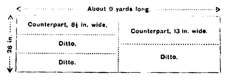 Engel’s transfer paper is sold in rolls of about 9 yds. long in two widths—20½ in. and 26 in. The rolls 20½ in. wide are made in one continuous grain of 20½ in., and also in two counterparts, each of 10 in. wide, as shown in the accompanying diagram:—