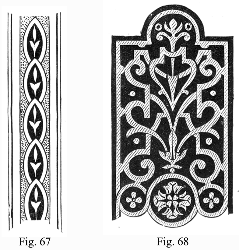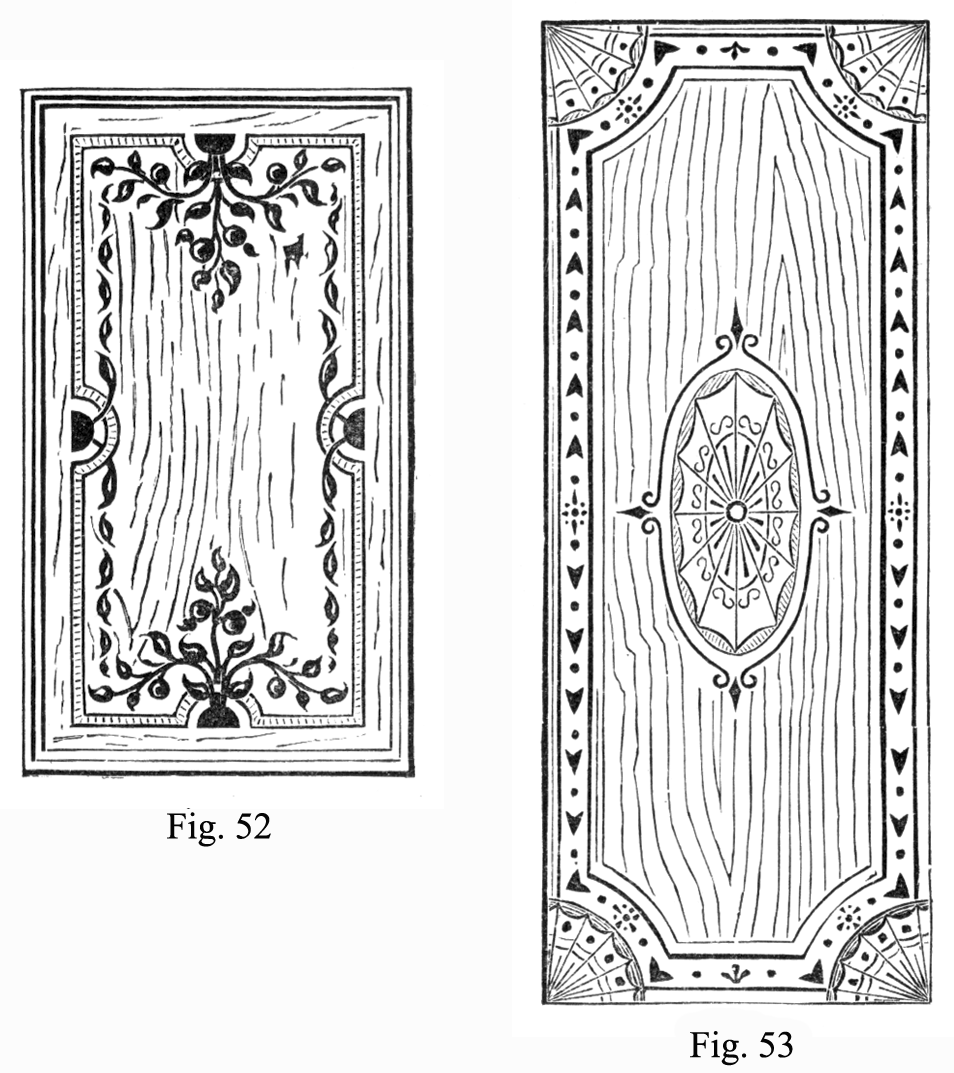 It must be understood that such aids as rollers, transfer and absorbent pairs, stencil plates, etc., are mentioned on their merits alone, and their use is not in any way recommended as being superior to good hand work. At the best they produce slavish copies, mere duplications of the originals, and these are hardly specimens of the painter and grainer’s art. The instructions in the following pages will be concerned only with the production of graining and marbling by approved hand methods. 29