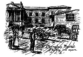 A charm and a glamor hangs over the generally commonplace business of buying and selling, getting gain and making provision for the humble needs of the day. The whole thing seems like a picture-book. The groups of voluble, good-humored habitant women; the queer little carts like ladders mounted on wheels; the small pink pigs, squealing their hardest as they are transferred from the crates of the vendors to the sacks of the purchasers; the background of tall, irregular buildings climbing the great cliff—these lend to the scene a color and character all its own.