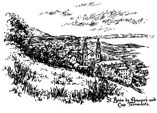 Go down, for instance, to Beaupré or St. Joachim, those parishes which Wolfe once so mercilessly harried. It is a fair and fruitful land, well-watered by the “full-fed river,” and over it now seems to brood the gentle angel of peace. Amongst the low curved roofs of the villages rise the towers of great churches, like that at Beauport and the miraculous St. Anne, whither every year come pilgrims in thousands seeking health or peace of mind. Behind these villages, if you step but a little aside from the splendid waterway of the St. Lawrence, you may lose yourself on sparsely-tracked, forest-covered hills, cleft with gullies, down which foam torrents, choked at times with thousands of grinding logs. But, after all, it is only a hermit who would long bury himself amongst these hills.