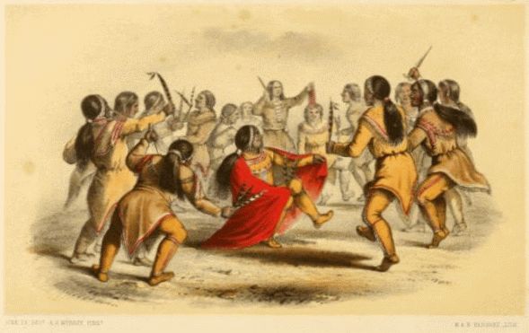 Mr. Murray’s letters describe the meetings of several tribes which he witnessed. On one occasion two parties who had been at war with each other, and had not yet arranged their differences, met at his encampment. Very long harangues were made by different members of the two bodies before they landed. After this, one party, stepping from their canoes, formed a circle and pranced round, yelling and shouting furiously. The other party landed a little way off, and ranging themselves in Indian file, the chief in front and the women and children in the rear, danced forward slowly, until they came up to the others; when the whole, joining in one circle, capered for half an hour, uttering the most horrible cries, the two chiefs meanwhile keeping in the centre.
