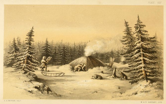 Each family possesses a deer-skin tent or lodge,—the skins used in winter being prepared without removing the hair, that the cold air may be more effectually excluded. In summer, when the family is travelling in quest of game, the tent is rarely erected. A winter encampment is made usually in a grove of spruce firs. The ground being cleared of snow, the lodge-skins are extended over flexible willow poles, which take a semicircular form, and are transported with them from place to place. The hemispherical shape of their lodges is not altogether unknown among the Chepewyans and Crees, being that generally adopted for vapour baths, which are framed of willow poles stuck into the ground at each end; but the lodges used by these nations for dwelling places are cones, formed by stiff poles meeting at the top. The lodges of the Kutchin resemble the Eskimo snow huts in shape, and also the yourts of the Asiatic Anadyrski. When the Kutchin winter-lodge is raised, snow is packed on the outside to half its height, and it is lined equally high within with the young spray of the spruce fir, that the bodies of the inmates may not rest against the cold wall. The doorway is filled up by a double fold of skin, and the apartment has the closeness and warmth, but not the elegance, of a snow house. Mr. Murray remarks, that though only a very small fire is usually kept in the centre of the lodge, the warmth is as great as in a log house. The provisions are stored on the outside, under a covering of fir branches and snow, and further protected from the depredations of the dogs by the sledges being placed on the top.